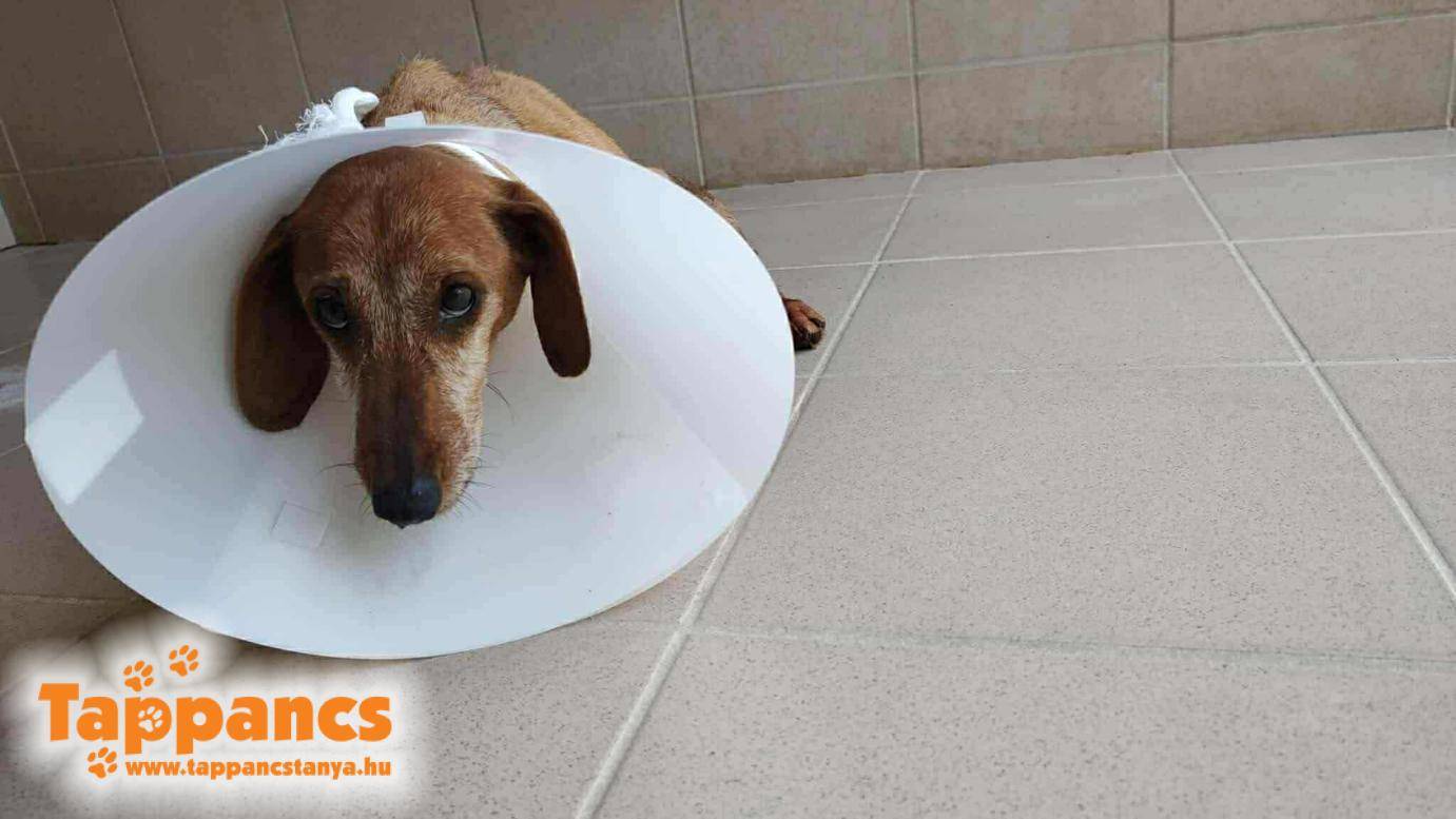 A kutya egyelőre ételt nem fogad el, így aztán kicsit körülményes az antibiotikum adagolása, hiszen ha hozzá akarunk érni, máris harapni akar. Ebben csak a gallér akadályozza meg, amit azért kapott, hogy ne tudja piszkálni a sebeit.