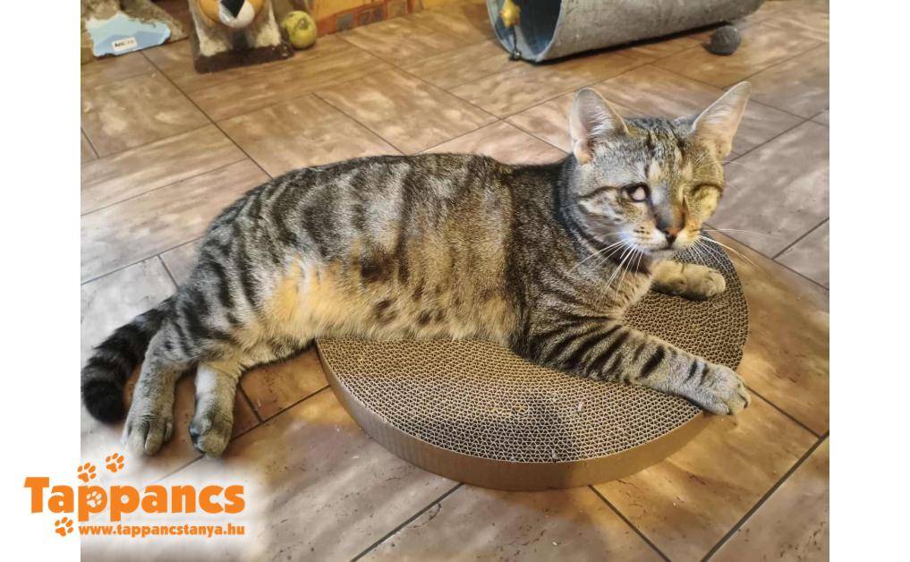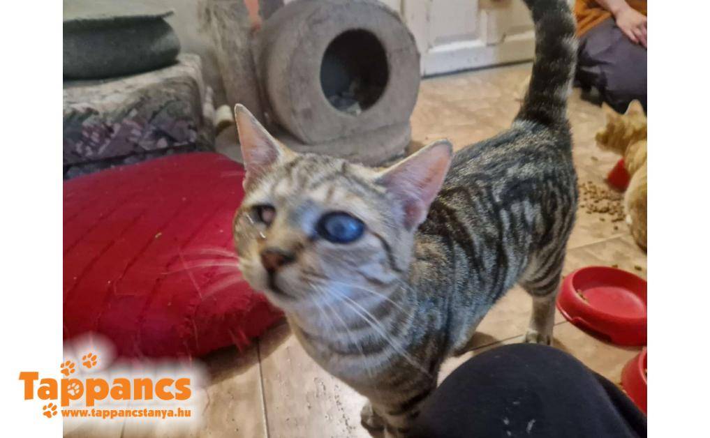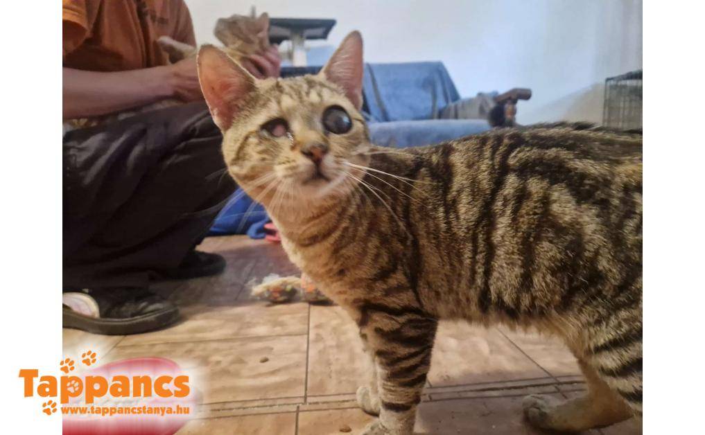Egy hölgy talált rá a mórahalmi körforgalomban, hazavitte, kezeltette náthából, első kombiját is beadatta, de nem tudta megtartani. Teljesen vak, ha kiengedte, kicsatangolt az utcára is, ahonnan nem tudott visszamenni, így bent vigyázott rá. Azóta túl esett egy szemeltávolításon is.