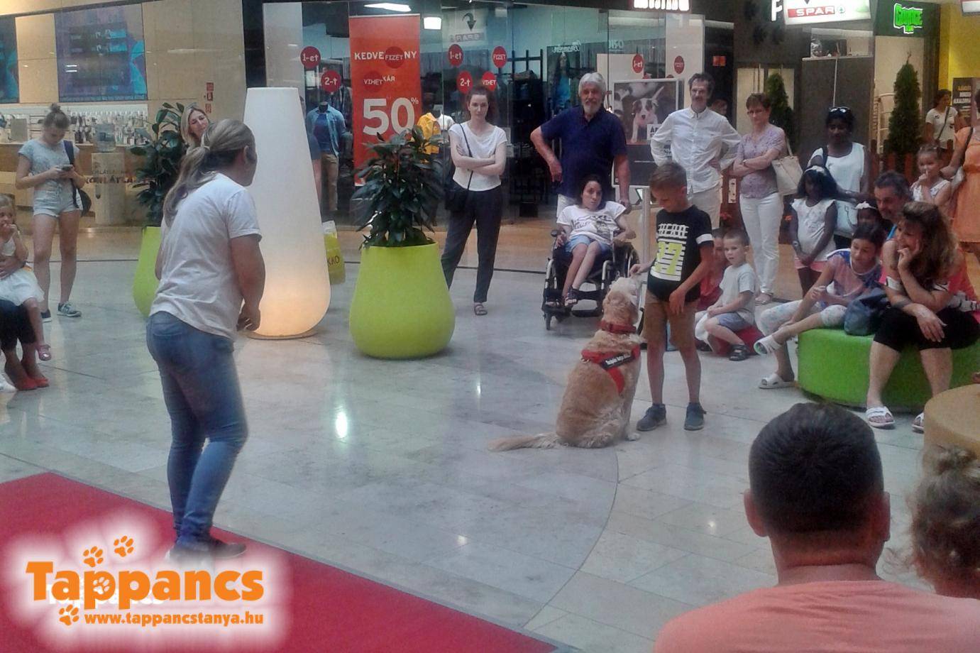 Vasárnap pedig Wágner Peti és Mendy tartott egy szuper trükkbemutatót. Ilyenkor aki nem tudja, hogy milyen rendezvény van, igencsak elcsodálkozik, hogy mit keres egy bevásárlóközpontban ennyi kutya :)  Nem titkolt célunk egyébként, hogy a kutyatartási kultúrán is változtassunk, és közelebb hozzuk a kutyás és nem kutyás tábort is az ilyen, és ehhez hasonló rendezvényekkel.