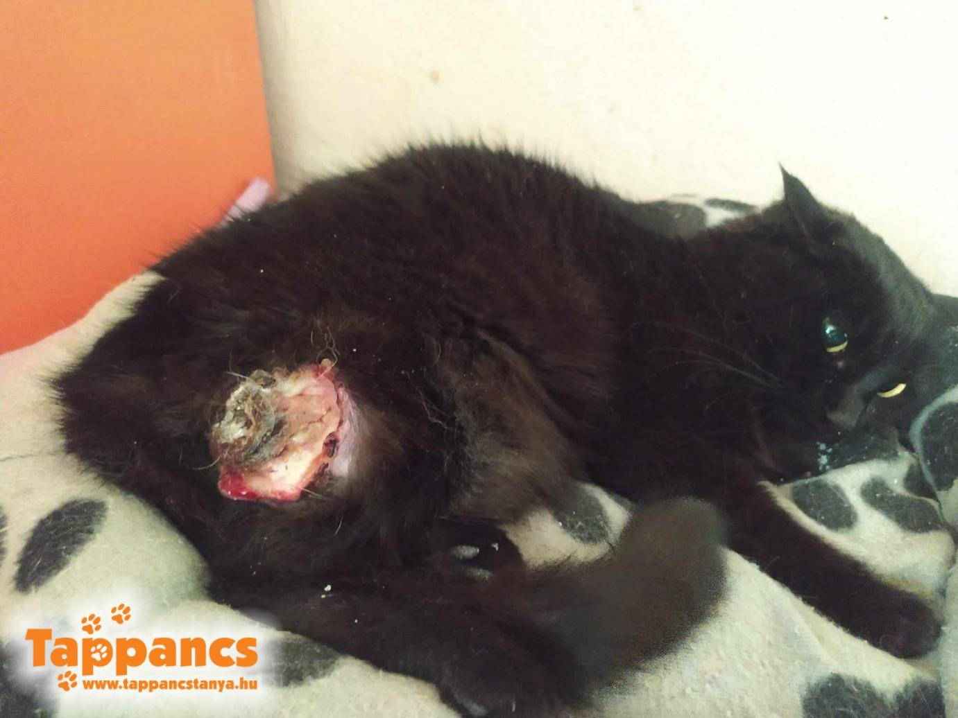 Még a nyáron egy fiatal nő kért segítséget a cicája miatt. Korábban utcáról befogadott cica, kinek a lábán volt egy kis seb, ami az elmúlt két évben eldurvult. Egyeztettünk állatorvossal és némi hozzájárulással megtörtént a lábműtéte. Majd most, két hónapra rá újra telefonált, hogy újfent előjött a lábán a seb, elviselhetetlen a bűz, és szeretné, ha finanszíroznánk a cica eutanáziáját. A döbbenettől kellett kis idő, míg felocsúdtunk, és inkább behívtuk a cicát. Megérkezett Bagira, aki két évig élt családban, rothadó lábbal...Tényleg elképesztő volt a szaga, de ezen nincs is mit csodálkozni, egy kifakadt, kezeletlen daganat tátongott. A fotók nem is adják vissza a teljes valóját. Lefertőtlenítettük, lekezeltük, és elkezdtük az antibiotikumos kúráját.