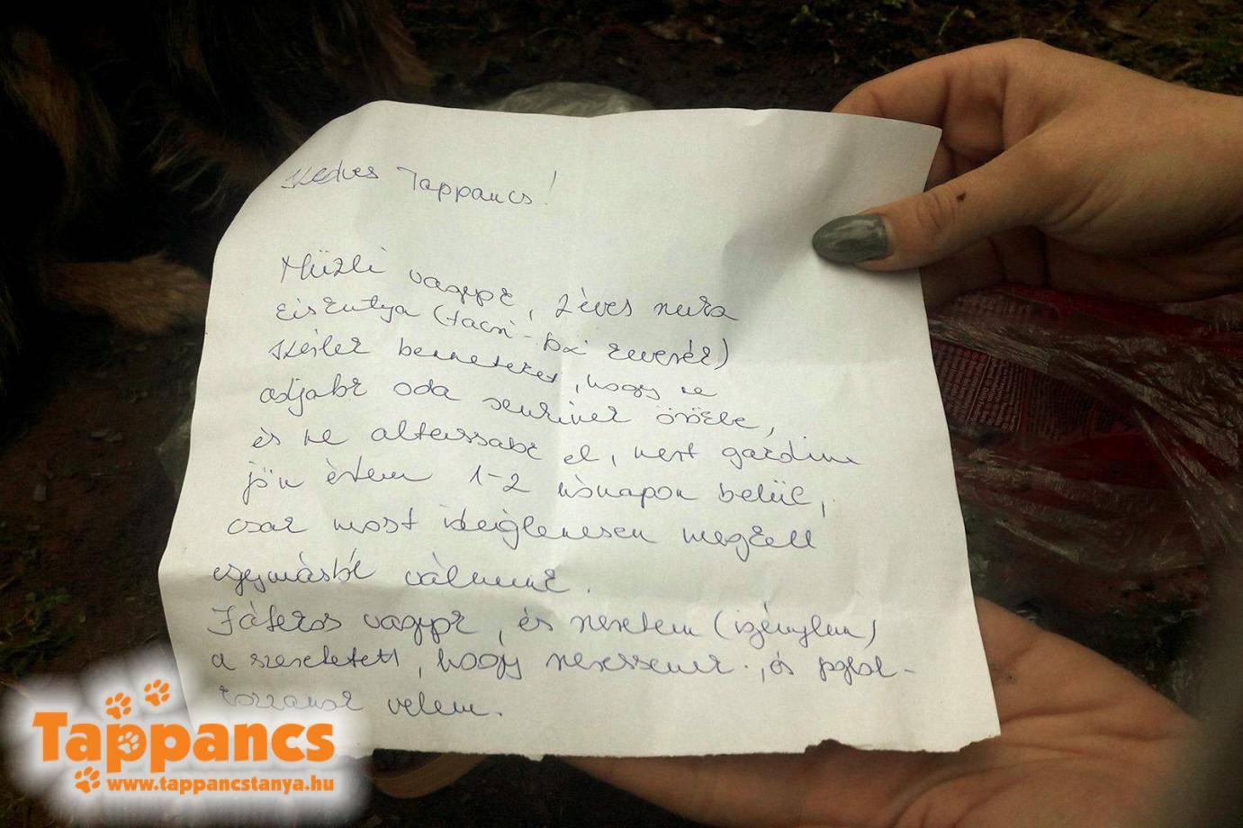 Igazam volt, másnap a menhely kapujához volt kötve szegény halálra rémült kutya, mellette egy zacskó táp, és egy levél. A levélben a kedves gazdi leírta, hogy ne adjuk örökbe másnak a kutyát, és ne is altassuk el! Még szerencse, hogy így utána nézett hová is adja (köti ki) az állítólagos kedvencét. Azt is leszögezte, hogy néhány hónap múlva érte jön. A két éves kutyának persze sem chipje, sem oltása, de ez egy cseppet sem meglepő. Gondolom, hogy egyik olvasó sem lepődik meg rajta, ha azt mondom, hogy iszonyúan dühösek vagyunk erre az emberre, aki ráadásul bűncselekményt követett el, de fel sem fogja, ahogy azt sem, hogy Müzlit már sohasem kapja vissza!