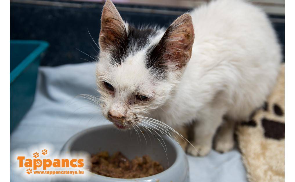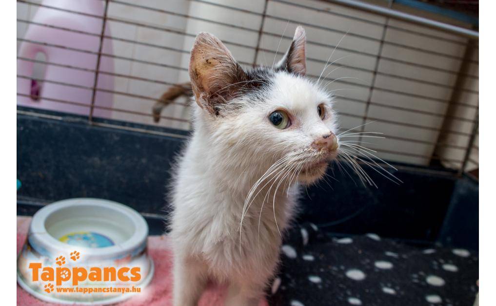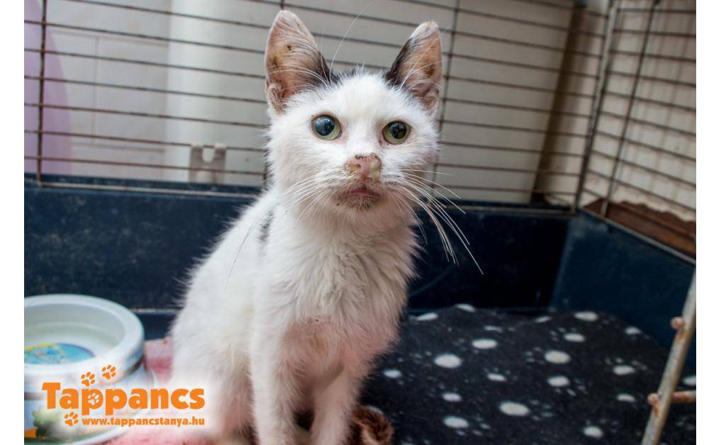 Egy családi ház udvarában, szorosan egy kutya mellé bújva találtak rá. Csont és bőr volt, a bolhák hemzsegtek benne. Legyengült, náthás, levegőt alig kapott. Gyógyszeres kezelése még folyamatban van. Egyébként nagyon cuki barátságos cica.