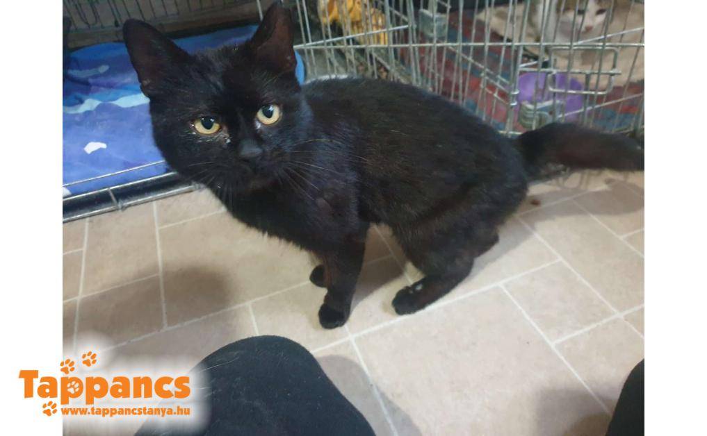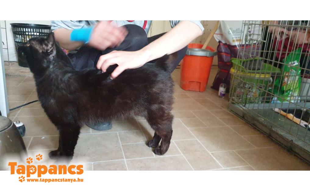 Zalán utcában az állatorvosunk talált egy balesetes cicát. Ellátva, ill. kicsit bebódítva érkezett meg a szép fekete kandúr. Fiatal, természetesen ivaros. A készített röntgen alapján a hátsó két csigolyája távolodott el egymástól. Jobb hátsó lábfején van egy seb, farka érzéketlen, nyilván a hátsó lábait amúgy sem használja. Kibéleltünk egy ketrecet, bepelenkáztuk az alját, mert kíváncsiak voltunk sikerül-e pisilnie. Az állatorvos adott neki mindenfélét, infúziót, fájdalomcsillapítót, antibiotikumot, amit nekünk is folytatnunk kell.