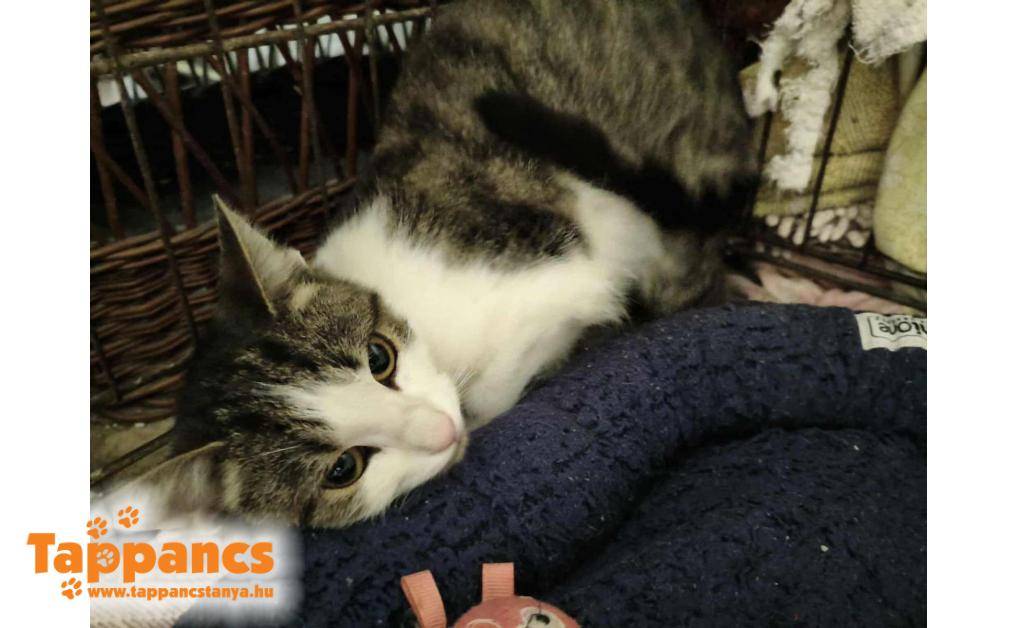 A menhely melletti erdőben bukkant fel, csipegette az elszórt tápokat, és egyre bátrabb lett, egyre közelebb ment a kutyás rèszhez, úgyhogy jobbnak láttuk befogni, mielőtt tragédia történik. Csapdával sikerült, max 10 perc alatt. Kicsit szutykos volt, de a kezdeti fèlelme hamar elillant, már nagyon bújós, dorombolós.